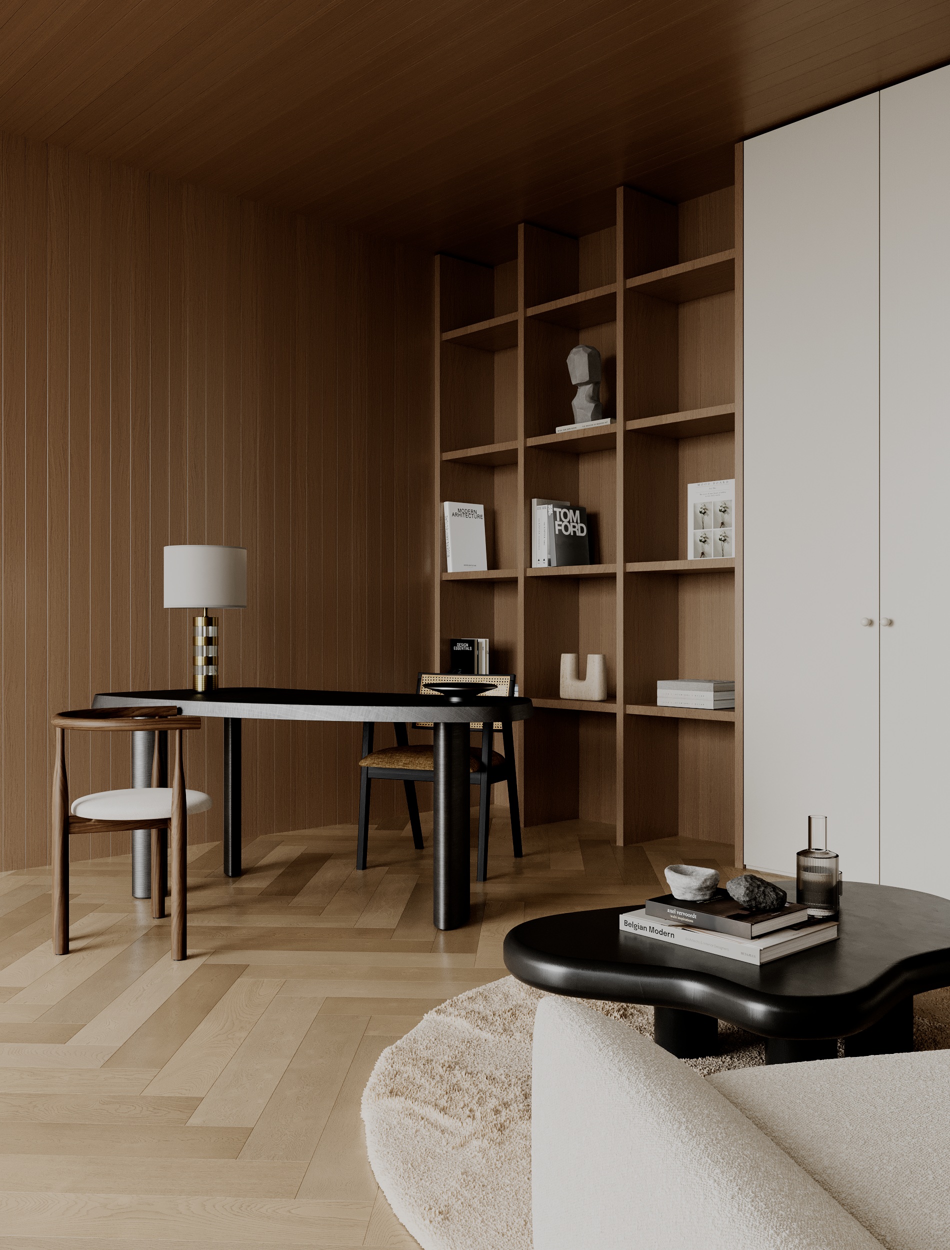 Sanctum is envisioned as a retreat located in Denmark, where architecture becomes the framework for calm, reflection, and connection. The room is not conceived as a clinical enclosure but as a space of stillness, carefully proportioned and layered with material warmth. Its floor plan establishes two distinct but complementary zones: a workspace anchored by a sculptural black desk and shelving, and a softer lounge setting arranged around a circular rug. The organisation is simple, intuitive, and unencumbered, allowing the occupant to shift seamlessly between focus and conversation, structure and ease.